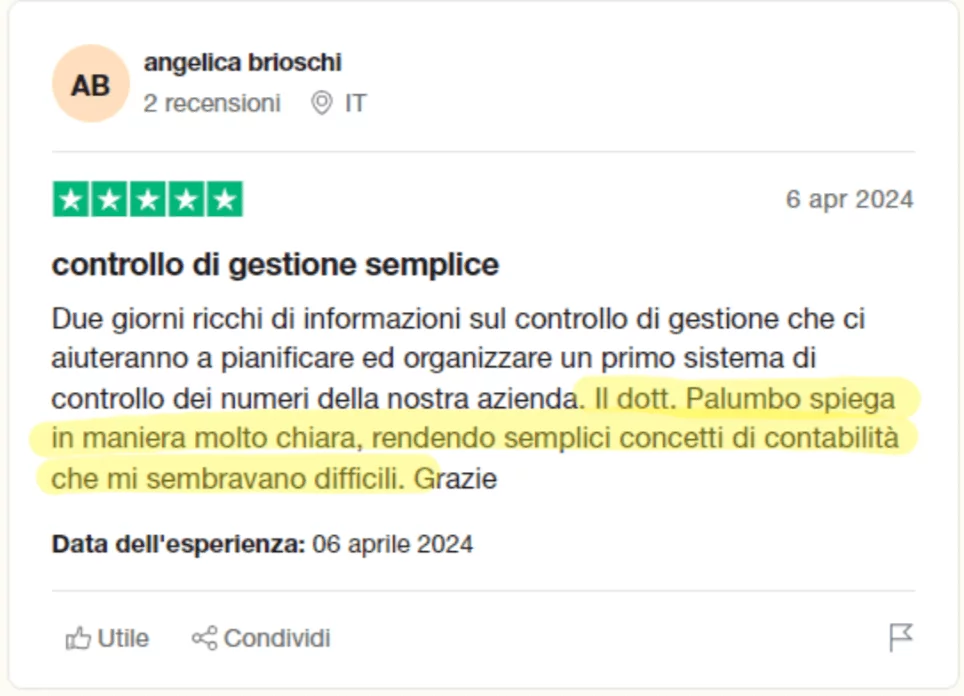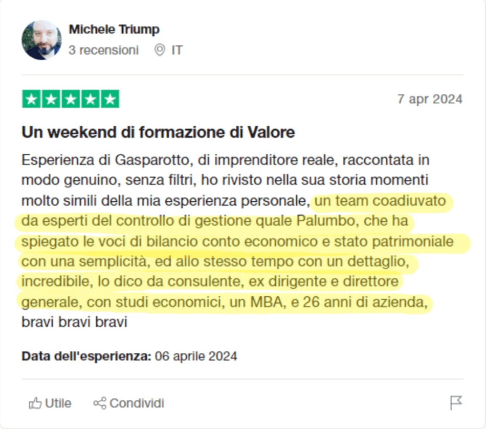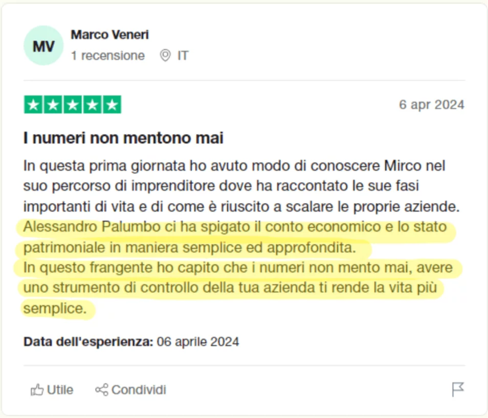 Ad oggi sono 6.000 gli imprenditori che grazie al suo Metodo Palumbo sono riusciti a riprendere il controllo della loro azienda, a controllare i numeri e a moltiplicare utile e compenso.